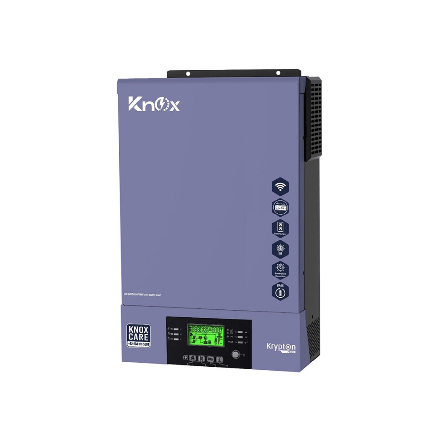 The Knox Krypton 7500 Hybrid Solar Inverter prioritizes reliability with dual outputs for smart load management and a wide PV input voltage range (90VDC to 500VDC) for diverse solar panel setups. It features built-in Wi-Fi for remote monitoring and a replaceable fan design for easy maintenance, ensuring uninterrupted operation. Compatibility with utility mains or generators and a battery-independent design enhance reliability during adverse conditions.